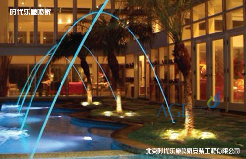 波光噴泉,波光跳泉的安裝數量可以根據環境的實際需要進行增減,可以單根成形,水柱從一個水池跳到另一個水池,也可以多支組合加以隨意控制,更能演變成美妙和諧的空中水動畫,令人迷醉。還可以裝置在人行道上,人們從水門中穿行,衣沾不濕,奇妙無窮。