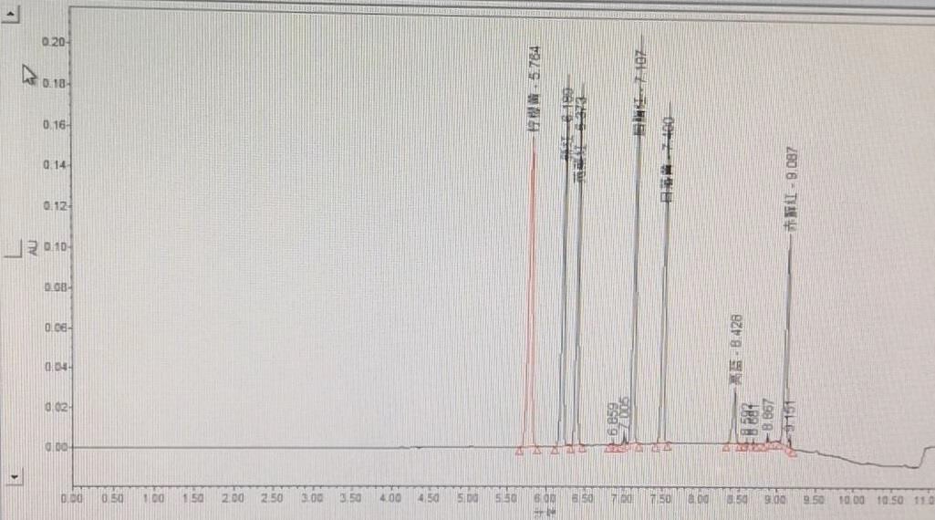 流動相:A: 0.02mol/L乙酸銨 B:甲醇*(流動相梯度略有調(diào)整)