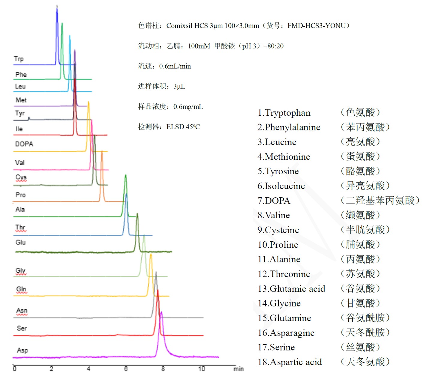 通過特殊的固定相設計,引入多重作用力(離子交換、疏水作用、氫鍵、HILIC等),從而使菲羅門Comix色譜柱可以保留和分離其他模式不可以解決的化合物。下面將列舉它們的有特色的應用: