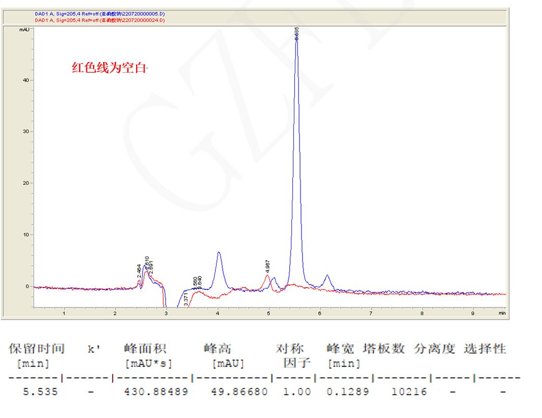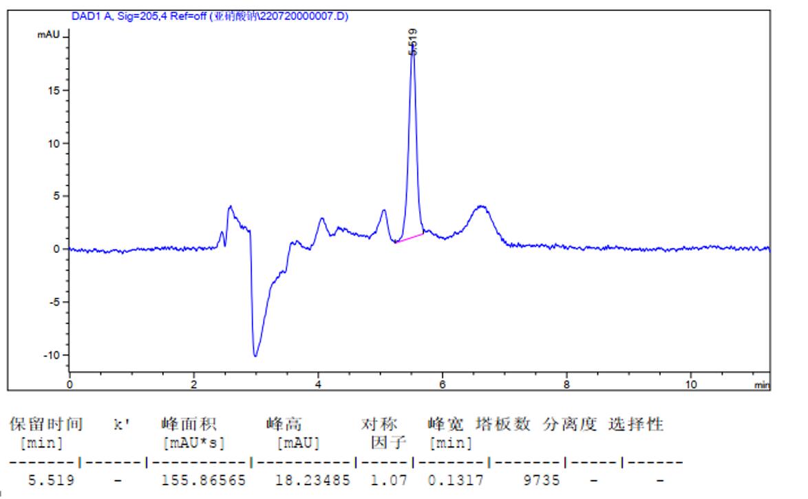 Comixsil RP-AX 在 HPLC+UV 體系,可以輕松分析亞硝根限度至 1ug/ml。根據(jù)結(jié)果,獲得極佳峰形與很好柱效,實際限度可以更低(因?qū)嶋H需求未再考察)。(案例中雜峰因樣品純度引起)。