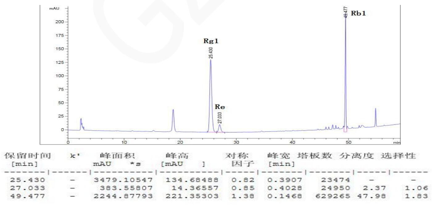 方法說明:使用 FastCore SuperC18 及 FastCore C18-AQ 均可以滿足 Rg1 與 Re 分離度問題,解決了分離度不佳的問題,同時塔板數亦可滿足中國藥典要求。