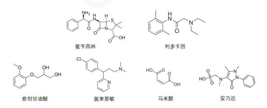 App ID: FLM-C240008 Comixsil RP-AX 同時(shí)分析鎮(zhèn)痛類(lèi)藥物制劑安乃近、利多卡因、愈創(chuàng)甘油醚、馬來(lái)酸氯苯那敏、氨芐西林 色譜柱: Comixsil RP-AX 3μm 150*4.6mm(貨號(hào):FMF-AXR3-EONU) 流動(dòng)相: 時(shí)間 水 乙腈 200mM 甲酸銨(pH 3.4) 0 55 10 35 10 25 40 35 10.01 55 10 35 20 55 10 35 流速:1.0 mL/min 檢測(cè)波長(zhǎng):255nm 柱溫:25℃ 樣品濃度:N/A 進(jìn)樣量:N/A 結(jié)構(gòu)式: