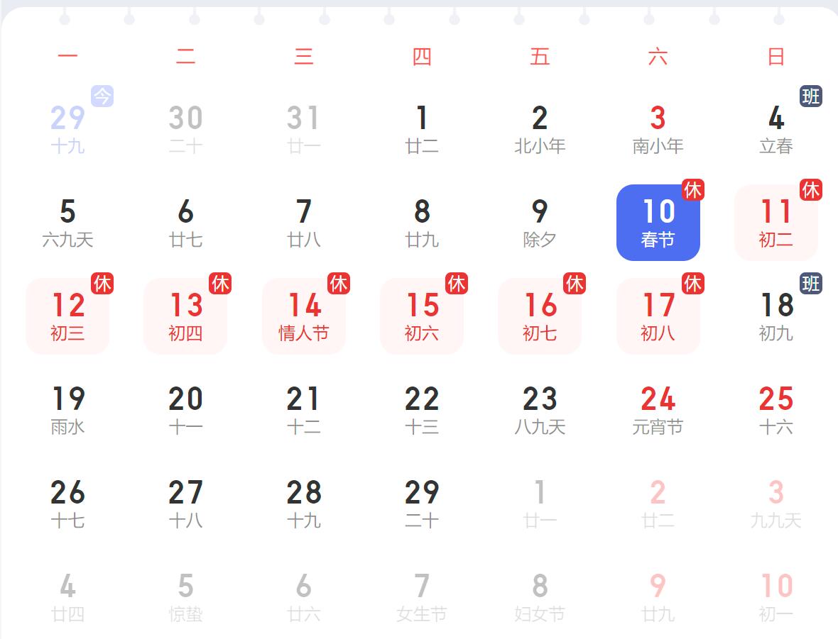 2月10日至17日放假調休,共8天。2月4日(星期日)、2月18日(星期日)上班。