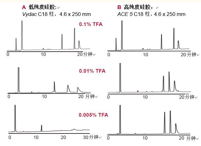 硅膠純度。高效液相色譜柱所用硅膠填料的純度對(duì)分離性能至關(guān)重要。金屬離子雜質(zhì)會(huì)導(dǎo)致峰拖尾和分辨率下降,如圖7A所示(0.01%和0.005%的TFA)。
