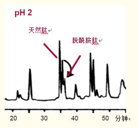 在pH為2的肽圖中,含有天冬氨酸的脫酰胺肽的疏水性比含天冬酰胺的天然肽略強(qiáng),因此比天然肽略晚洗脫出來,如圖39所示。